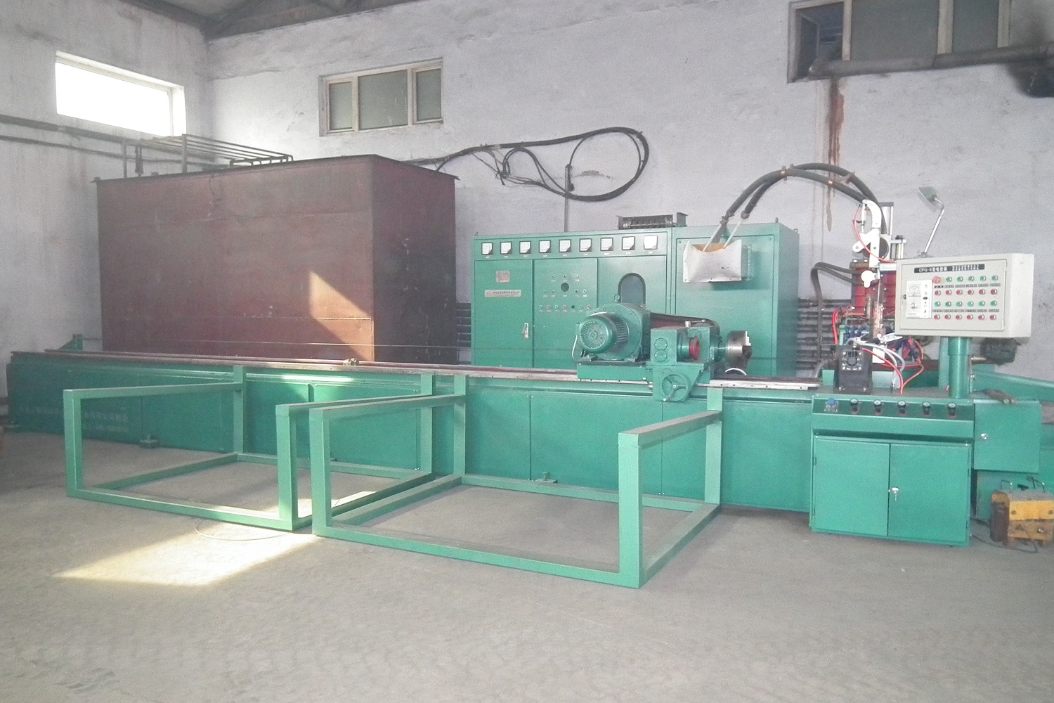 1、 機(jī)床采用鋼軌加工形成軌道,拖動(dòng)部分采用5.5kw電磁調(diào)整電機(jī)經(jīng)變速箱輸出至卡盤,形成4.5-16mm,8種螺距,具有快速回車功能,光管支架,翅片管支架采用自動(dòng)控制。